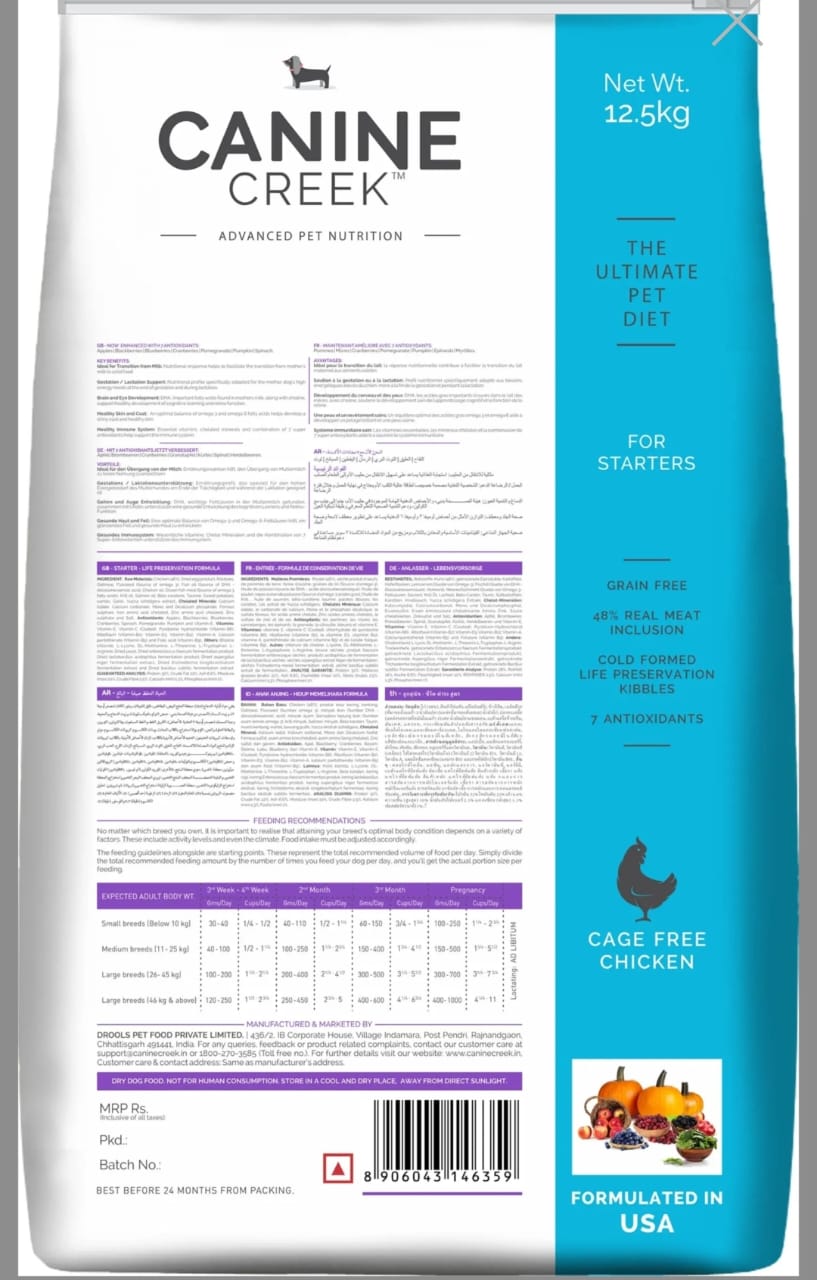 Choosing the right food for your puppy can be challenging, but Canine Creek Starter Grain Free 12kg makes it easier. This premium puppy food is designed to provide balanced nutrition without grains, so your puppy gets the best start in life.Canine Creek Starter Grain Free 12kg contains high-quality ingredients to support your puppy’s growth and development. With a blend of proteins, vitamins, and minerals, your puppy will enjoy a complete diet that promotes healthy bones, muscles, and immune system. Plus, because it’s grain-free, it’s ideal for puppies with sensitivities or allergies.One of the standout features of Canine Creek Starter Grain Free 12kg is its carefully selected ingredients. It includes real chicken, which is an excellent source of protein, essential for muscle development and energy. The addition of fruits and vegetables provides essential vitamins and antioxidants, supporting overall health and vitality. Omega-3 and Omega-6 fatty acids are also included to promote healthy skin and a shiny coat.