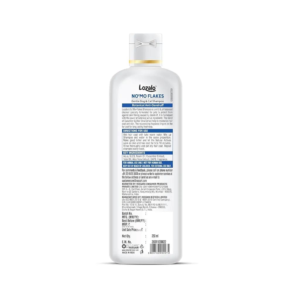Lozalo Botanical No’mo Flakes Anti Dandruff Pet Shampoo – 250 ml, Anti Dandruff Shampoo for Dogs & Cats of All Breeds, Natural Shampoo with Cucumber & Aloe Vera Extract, Paraben Free